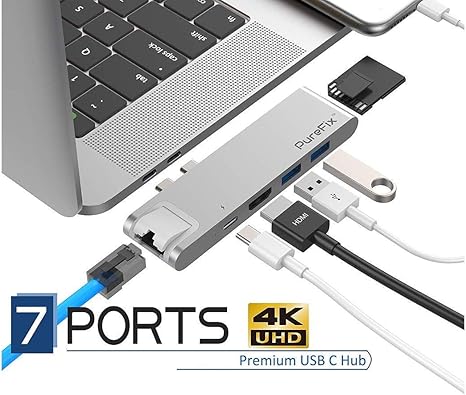 Amazon Com Purefix Usb C Hub 7 In 1 Dual Type C Adapter Silver For Macbook Pro 13 15 Gigabit Ethernet Power Delivery Thunderbolt 3 4k Hdmi Microsd Sd Card Reader Computers Accessories