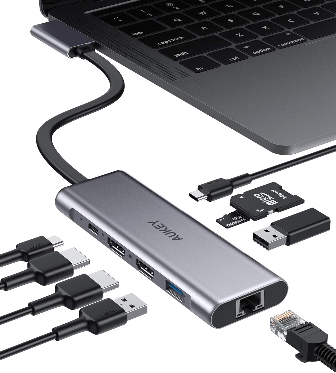Amazon Com Aukey Usb C Hub Macbook Pro 9 In 2 Triple Display With Dual 4k 60hz Hdmi 1gbps Rj45 Ethernet 100w Pd Charging 2 Usb 3 0 And Sd Tf Card Reader Thunderbolt 3 Type C Docking